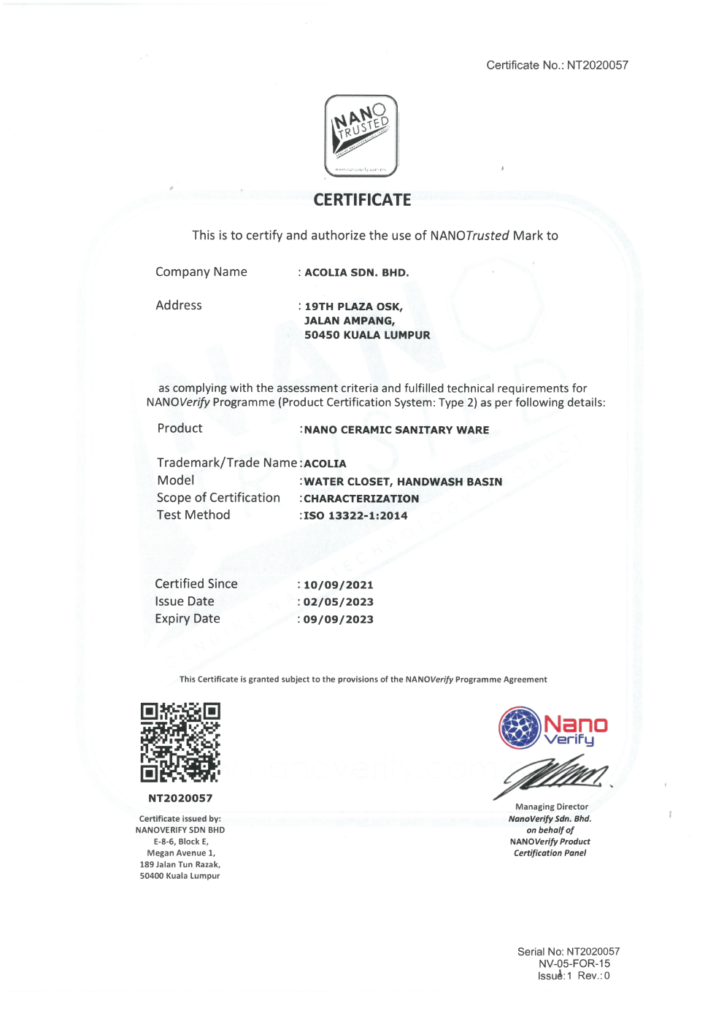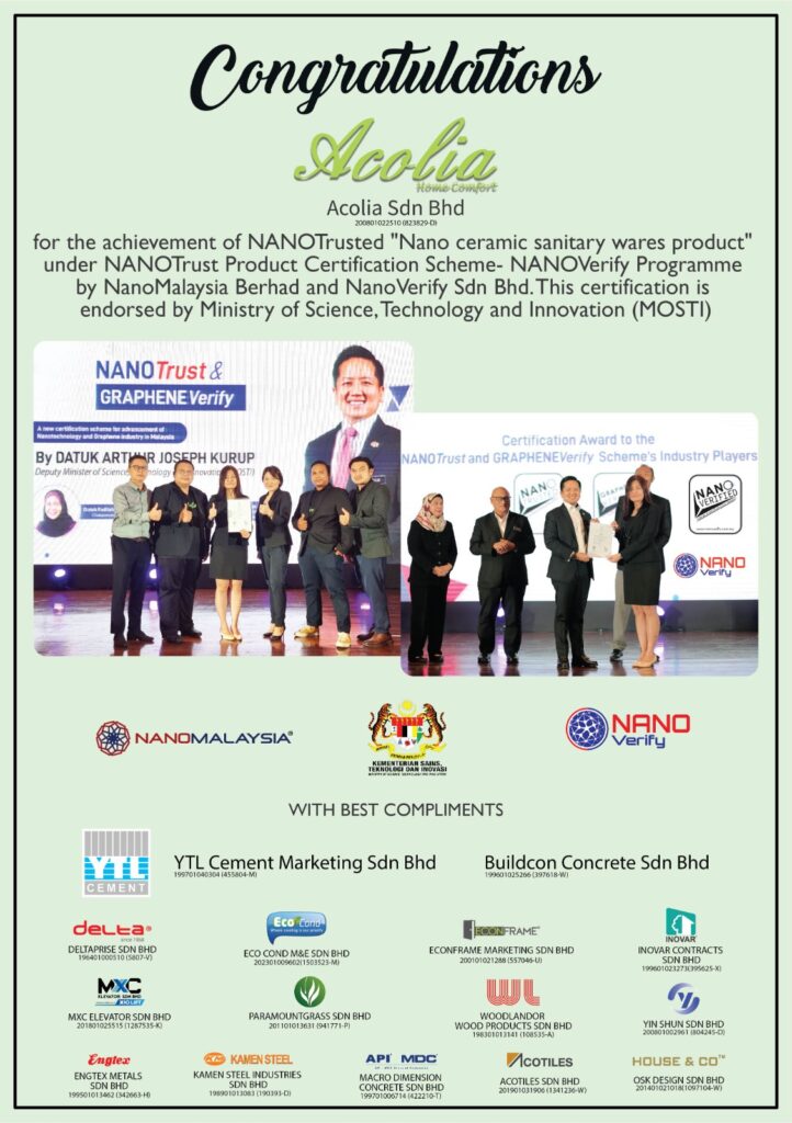 Acolia, a leading supplier of bathroom and sanitary products in Malaysia, has been awarded the prestigious NanoTrust certification from NanoMalaysia Berhad for its innovative Nano Technology Glaze products. The award was given by the Ministry of Science, Technology, and Innovation (MOSTI) of Malaysia, in recognition of Acolia’s efforts in introducing advanced nanotechnology in the manufacturing of its products.